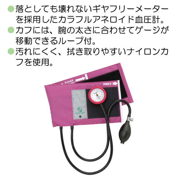●落としても壊れないギヤフリーメーターを採用したカラフルアネロイド血圧計。