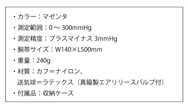 ●材質:カフ=ナイロン、送気球=ラテックス(真鍮製エアリリースバルブ付)