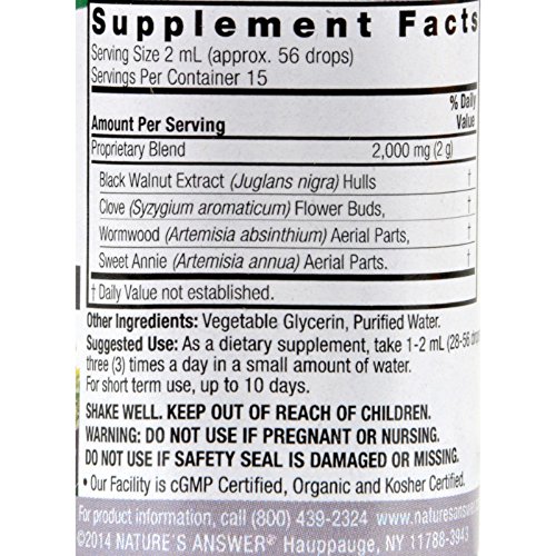 Studio : Nature s Answer Publisher : Nature s Answer Binding : Health and Beauty Product Description Natures Answer Black Walnut and Wormwood Complex Alcohol Free Description: Alcohol-Free Combination Extract Herbal Supplement Holistically Balanced Natures Answer alcohol-free extracts are produced using alcohol, water and natural extractants. All alcohol and extractants are then removed through our cold Bio-Chelated proprietary extraction process, yielding a Holistically Balanced standardized extract. Liquid extracts are absorbed faster than tablets or capsules, and are more potent than tinctures. Holistically Balanced guarantees that the constituents of the extract are in the same synergistic ratios as in the plant. Manufactured in our FDA registered and pharmaceutically licensed facility; Unconditionally guaranteed. Free Of Alcohol.