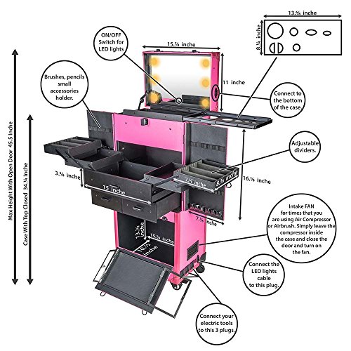 Featuring extra outlets for Hair dryer, Flat Irons, Hair straighteners, Lighted Makeup case with LED lights.