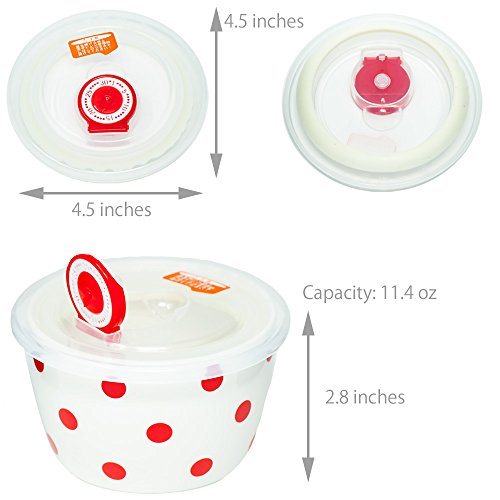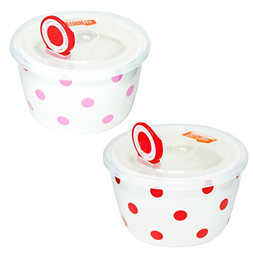 2 Piece Ceramic Bowl Set with Plastic Lids (Microwave and Dishwasher Safe) , Red/Pink Polka-Dots Print