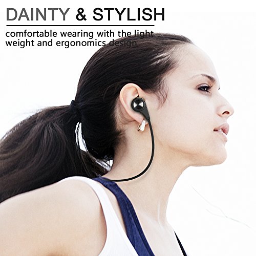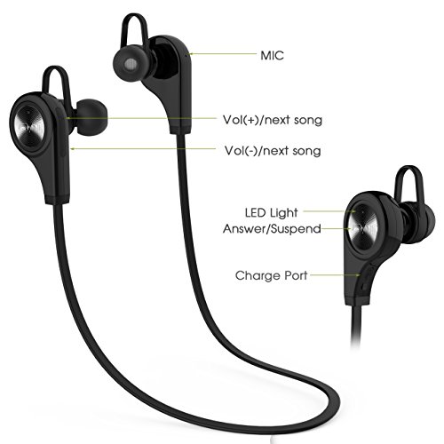 -. Feature : LAEST BLUETOOTH TECHNOLOGY --- Bluetooth 4.1 technology provides high-fidelity stereo music and clear speech with up to 5 hours of continuous talking / music time; easy and fast pairing with all the bluetooth enable smartphones, tablets and other bluetooth enabled music devices. / INNOVATION DESIGN --- With soft smooth silicone gel surface, this Bluetooth headphone is designed to naturally fit the contours of your ear. Different sizes of earbud tips are provided to guarantee constantly comfortable feeling. / MULTI-FUNCTION --- This Bluetooth earphone allows you realize remote control to your devices, such as, volume up/volume down, previous track/next track, answer/end calls. Build-in microphone makes your phone call hands free. / UNIVERSAL COMPATIBILITY --- Ideal for iPad, iPhone, iPod Touch, Android Smartphones, tablets, Bluetooth-enabled music players and any devices with Bluetooth connection. / EXCELLENT BATTERY PERFORMANCE: The polymer 70mAh battery support 5 hours of playing/talking time and 100 hours of stand-by operation with a single charge, so you have less time charging and more time playing.