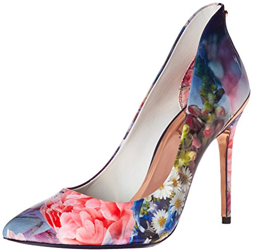 This dress pump from ted features an exaggerated heel counter offered in both patent and bright suedes for the spring season.