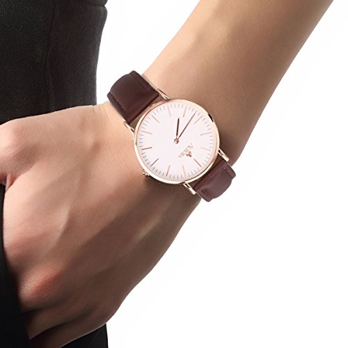 -. Feature : Round stainless steel watch with minimalist white dial featuring rose gold-tone hands and hour markers / 36 mm stainless steel case with mineral glass dial window / Quartz movement with analog display / Leather band with tonal stitching and buckle closure / Withstands splashes or brief immersion in water, But not suitable for swimming