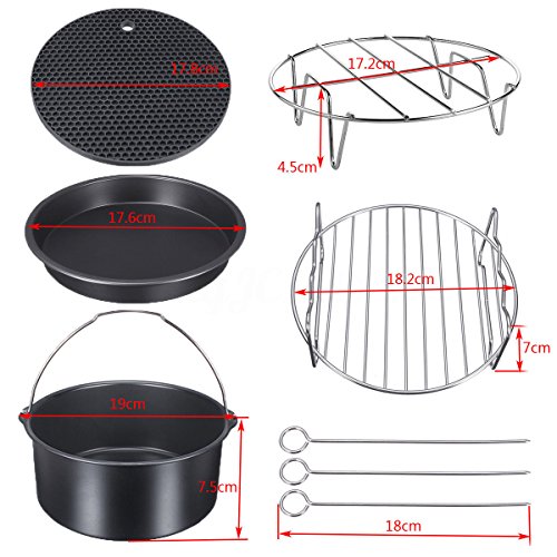 - √ 5 PCS AIR FRYER ACCESSORIES - Includes 1 Cake Barrel, 1 Pizza Pan, 1 Metal Holder, 1 Multi-Purpose Rack with Skewers and 1 Silicone Mat.
