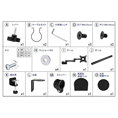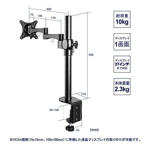 製品仕様 対応規格:VESAマウントインターフェース(FPMPMI)75mm/ 100mm 耐荷重:10kg 対応サイズ:17~27インチ 取り付け可能天板: 厚さ:10~80mm 奥行き:100mm以上 寸法:約42cm*40cm*12cm 重量:約2.2kg