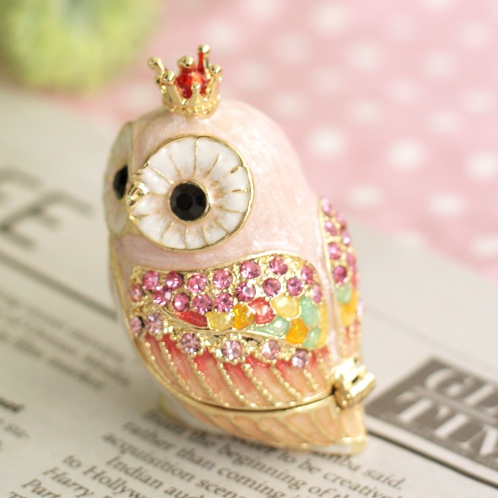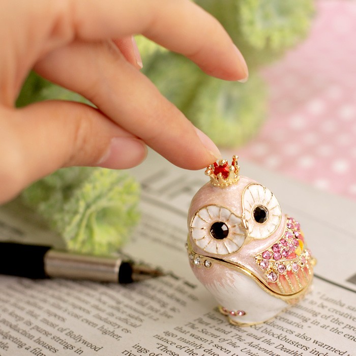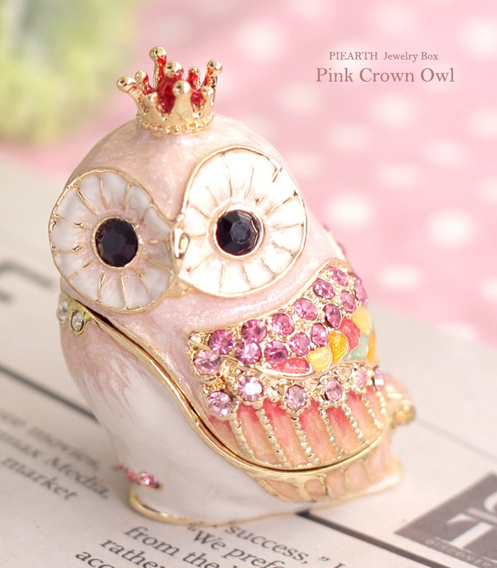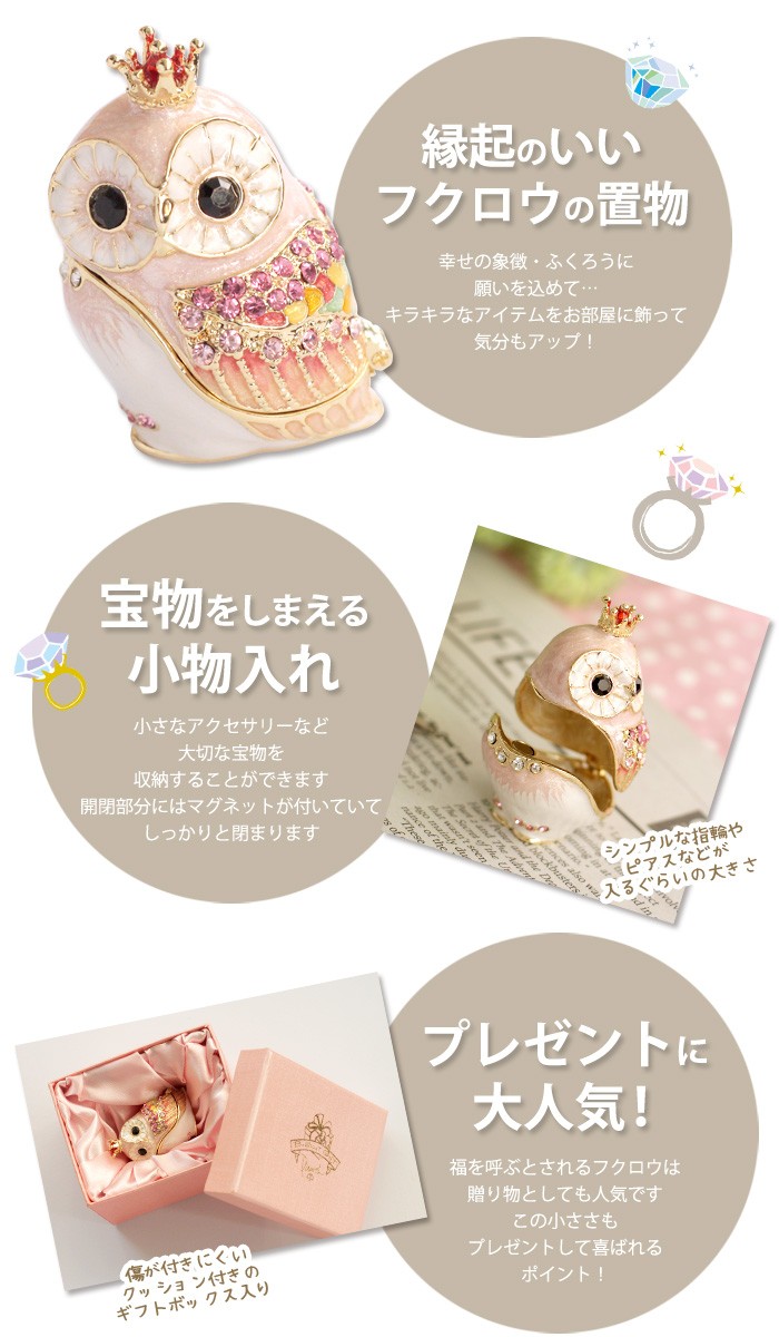 | ジュエリーボックスと言えば、指輪やピアス、ネックレスなどのアクセサリーを入れる引き出し型のケースを思い浮かべる方が多いかもしれません。 ピィアースのジュエリーボックスは、動物や花などをモチーフに作られ、合金製でずっしりとした重さがあります。また高品質のクリスタルガラスを贅沢に使用。まるでジュエリーボックスそのものが宝石のような、高級感溢れる仕上がりです。 小物入れとしても使えるように開閉口には磁石が取り付けてあり、アクセサリーなどなくしやすいアイテムの収納ができます。キラキラと美しく輝く宝石箱は、そのまま飾って楽しめるインテリア雑貨として多くの方に愛されています。 国内トップクラスのジュエリーボックスメーカーであるピィアースは、2004年ごろから本格的に宝石箱の製造を始め、現在のジュエリーボックスはなんと300種類以上。大規模展示会でもご好評いただいており、全国有名百貨店でも販売されています。 自社工場でひとつひとつ丁寧に手作りし、原型作成、研磨、加工、着色、小さなクリスタルガラスの取り付けなども全て手作業で行われるこだわりのハンドメイド品。完成後は厳しい検品の後、丁寧に梱包作業をしお客様にお届けしております。 ピィアース商品は、全国有名百貨店および全国有名宝石店チェーンにてお取り扱いいただいている高品質商品です。 ★自分へのご褒美に…コレクションして並べて飾ると、さらにかわいらしさUP! ★恋人へのプレゼント…中にアクセサリーを入れて、サプライズな贈り物として ★家族への感謝ギフト…お母さんや姉妹へ、日頃のありがとうの気持ちを込めて ★誕生日プレゼント…お友達の喜ぶ顔が見たいから、いつもと違うキラキラギフトを ★小さな女の子へ…まるでお姫様が使っているようなキラキラ宝石箱は女の子の憧れ! |