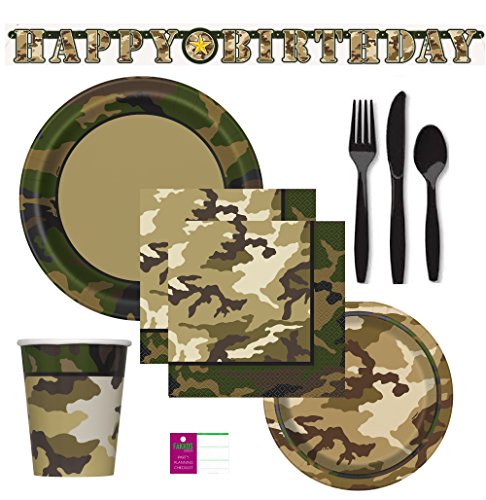 -. Title : Military Camo Hunting Fishing Party Supplies For 16 Guests Includes: Large Plates, Small Plates, Napkins, Cups, Large Birthday Banner And 48 Piece Premium Plastic Cutlery Set