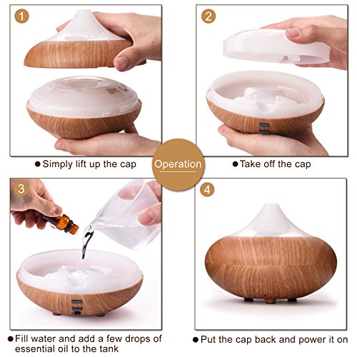 EASY TO USE AND SAFE: Use the measure cap (not included in the package) to supply water (do not add high temperature water) from the water pipe, pay attention to the filled water level; do not exceed the max line, and please do not add water when the Ultrasonic Essential Oil Diffuser is working. Drop essential oil into water tank vertically. BPA free, worry free from the quality issue.