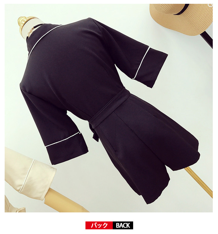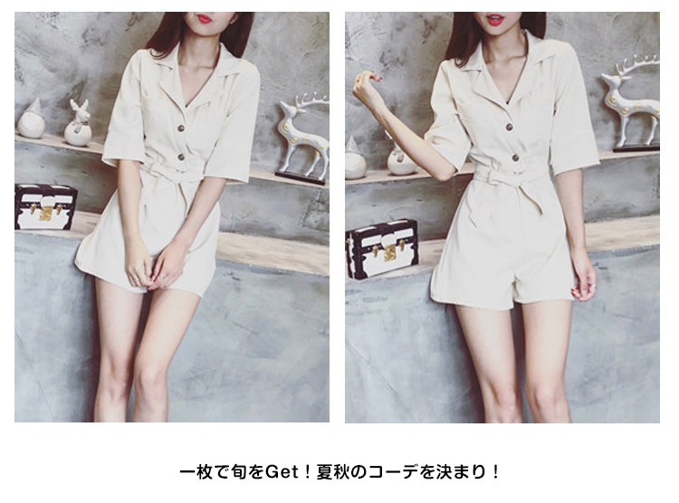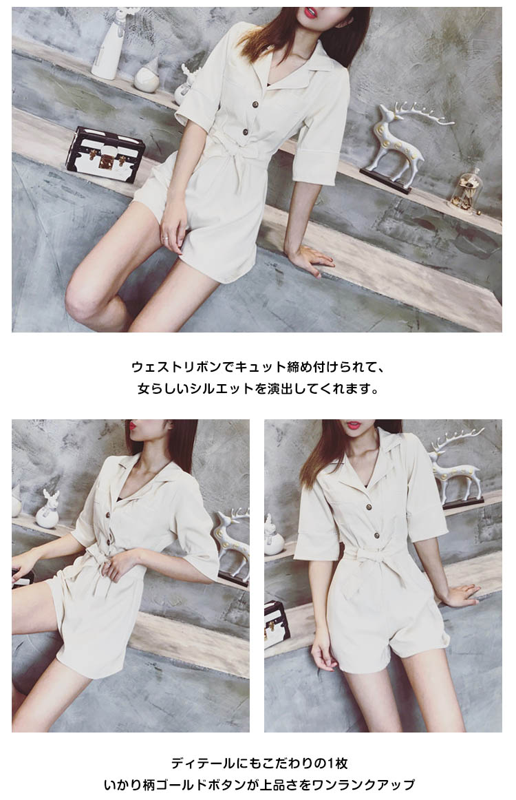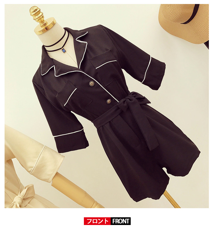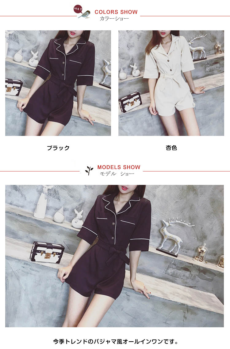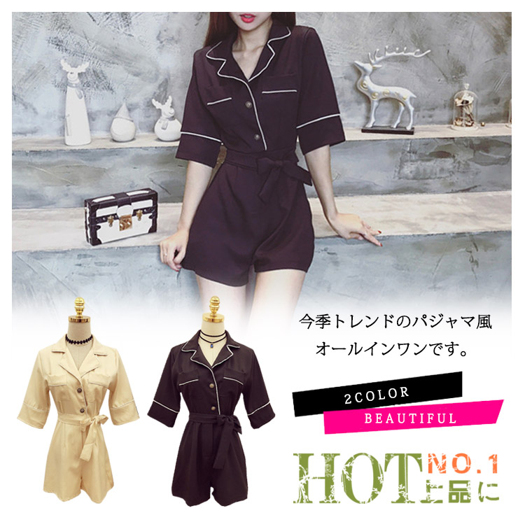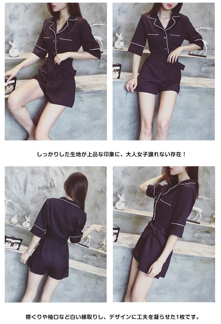 | 今季トレンドのパジャマ風オールインワンです。しっかりした生地が上品な印象に、大人女子譲れない存在!襟ぐりや袖口など白い縁取りし、デザインに工夫を凝らせた1枚です。ウェストリボンでキュット締め付けられて、女らしいシルエットを演出してくれます。ディテールにもこだわりの1枚いかり柄ゴールドボタンが上品さをワンランクアップ一枚で旬をGet!夏秋のコーデを決まり! | |