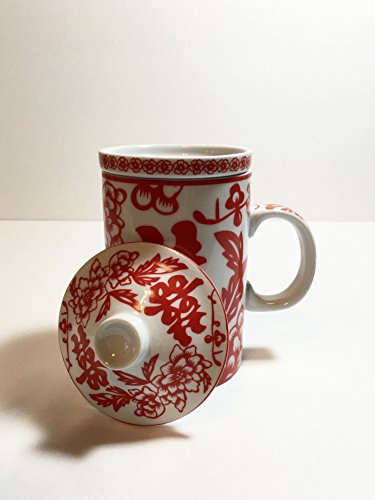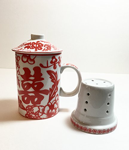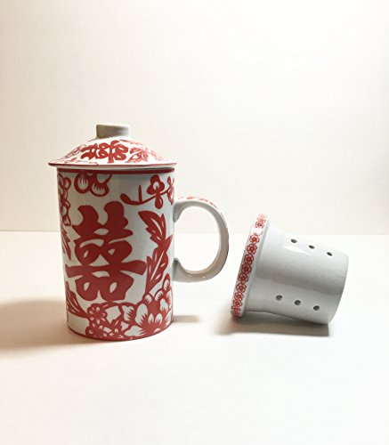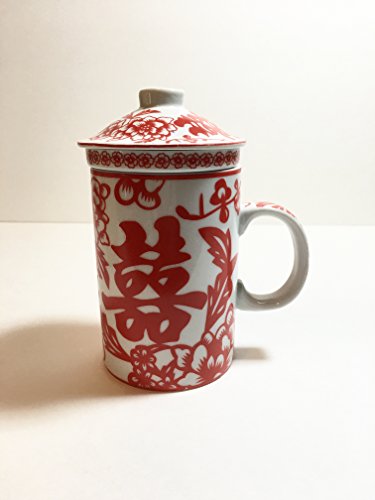 -. Feature : Lovely vibrant colors! / Features Gorgeous Floral Pattern and Double Happiness Design! / Beautiful Porcelain Tea Cup with Strainer and Lid