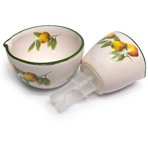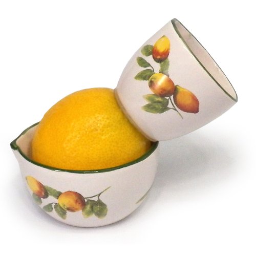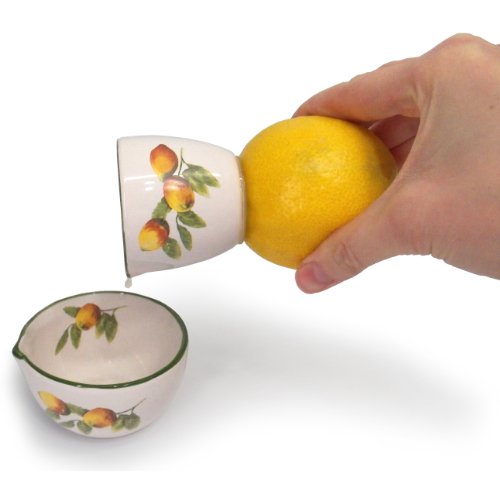 -. Feature : Ideal for cooking and entertaining, doubling as lemon juicer and stylish tabletop accent piece / 2-piece ceramic lemon juicer to match your table decor / Top-rack dishwasher safe / Dispense fresh lemon juice when you need it and as you need it / Set includes: one Juicynista lemon juicer; one matching storage cup