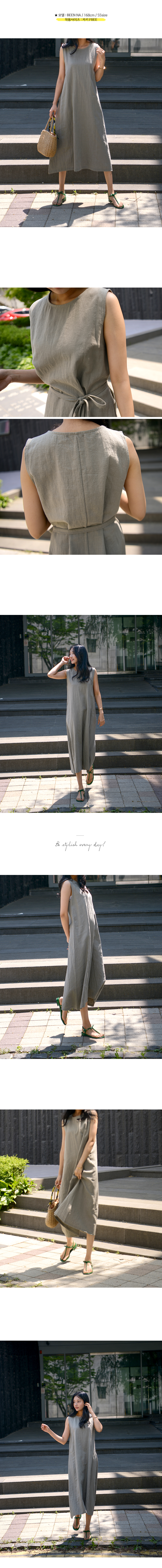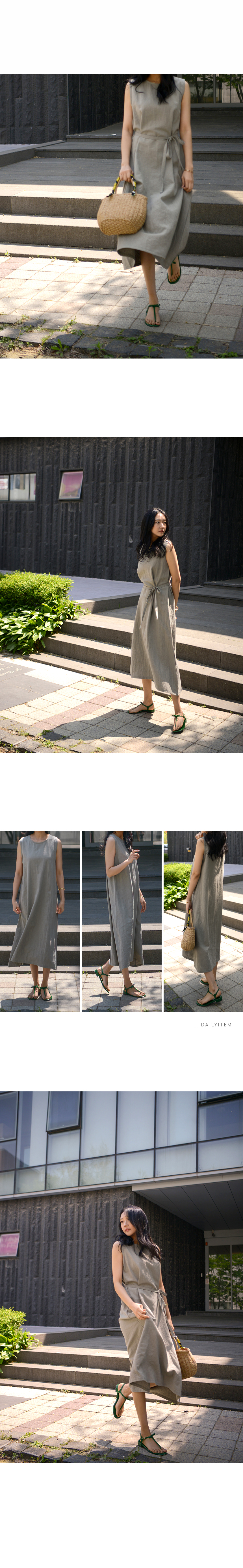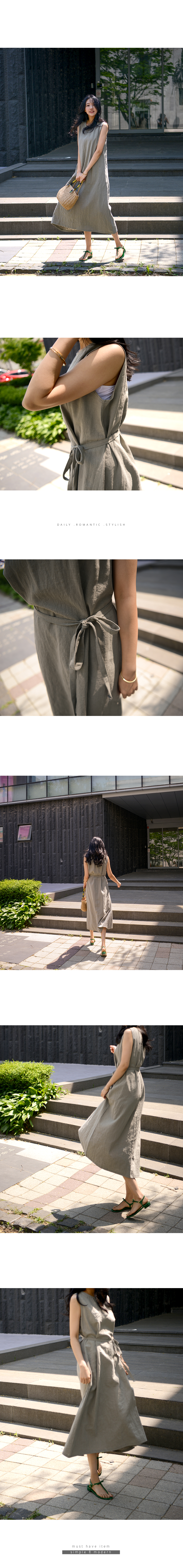 네추럴한 린넨 100% 소재감이시원한 슬림 A라인의 롱원피스에요 단정한 라운드넥에 넓지 않은 어깨너비로 깔끔하고 시원한 민소매 상의에가슴선아래로 A라인으로 퍼지며 길게이어지는 핏이 날씬하고 길어보인답니다제감의 리본으로 허리를 강조해 입어도멋스럽고 리본없이 편하게 툭 떨어지는스타일로 입어도 편하고 예뻐요심플하고 편안한 스타일로 한여름까지데일리룩으로 좋은 아이템이랍니다색상은 소라, 카키, 네이비사이즈는 FREE 44~66반