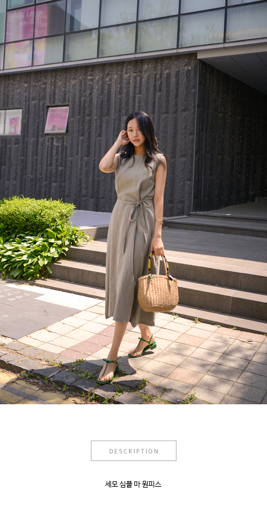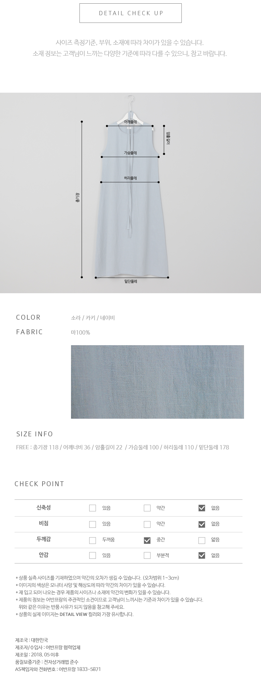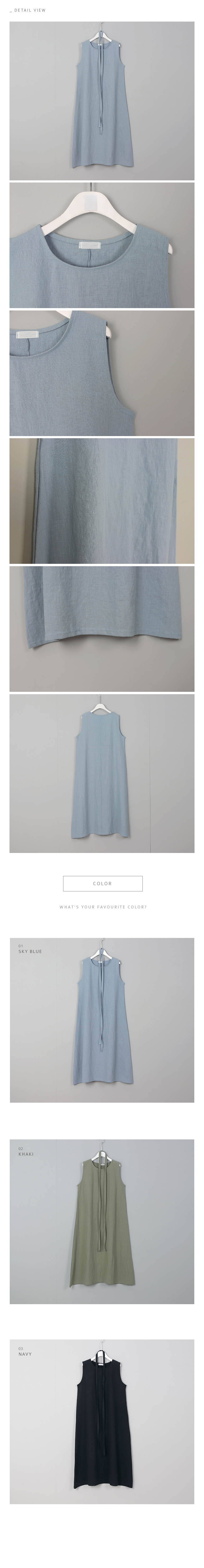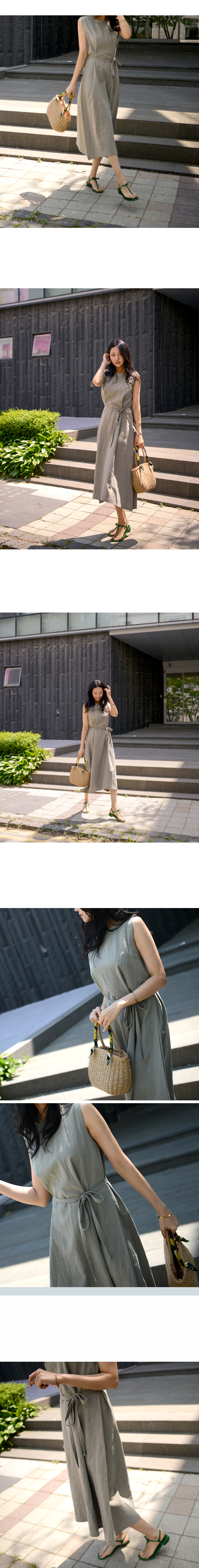 네추럴한 린넨 100% 소재감이시원한 슬림 A라인의 롱원피스에요 단정한 라운드넥에 넓지 않은 어깨너비로 깔끔하고 시원한 민소매 상의에가슴선아래로 A라인으로 퍼지며 길게이어지는 핏이 날씬하고 길어보인답니다제감의 리본으로 허리를 강조해 입어도멋스럽고 리본없이 편하게 툭 떨어지는스타일로 입어도 편하고 예뻐요심플하고 편안한 스타일로 한여름까지데일리룩으로 좋은 아이템이랍니다색상은 소라, 카키, 네이비사이즈는 FREE 44~66반