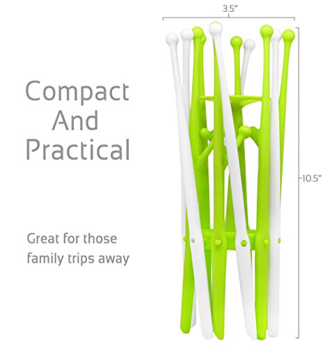 You'll be confident in your purchase knowing this baby bottle drying rack is phthalate free, latex free, BPA and lead-free. Dishwasher-safe on the top rack, folds up easy for storage, taking up very little room. It looks as well folded up as it does "in bloom." Weighing in at only 10.4 ounces, 3.5" by 10" folded up, and only 12" in diameter unfolded, making it stylish and compact.