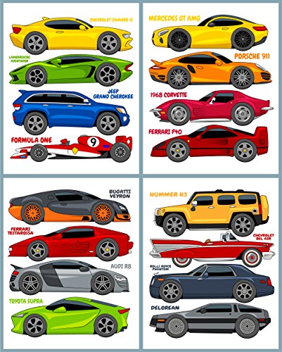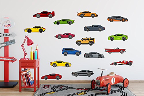 16 Cartoon Cars Peel & Stick Vinyl Wall Decals / Stickers - Nursery, Boys, or Kids Room, Camero, Lamborghini, Corvette, Ferrari, Bugatti, Delorean, and more