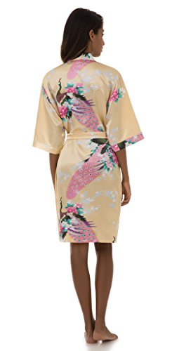 Dingwangyang Women's Peacock Print Half Sleeve Silk Kimono Bridesmaid Robe Nightgown(Gold,M)