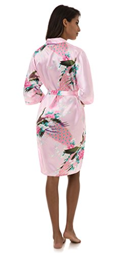 Dingwangyang Women's Peacock Print Half Sleeve Silk Kimono Bridesmaid Robe Nightgown(Pink,M)