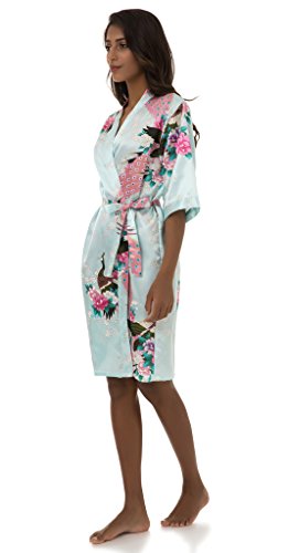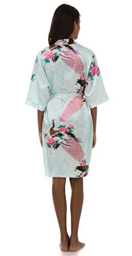Dingwangyang Women's Peacock Print Half Sleeve Silk Kimono Bridesmaid Robe Nightgown(Light Blue,M)