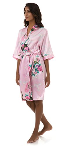Dingwangyang Women's Peacock Print Half Sleeve Silk Kimono Bridesmaid Robe Nightgown(Pink,S)