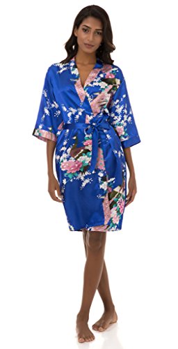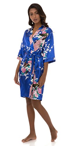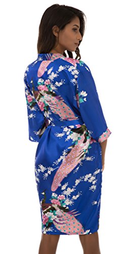 Dingwangyang Women's Peacock Print Half Sleeve Silk Kimono Bridesmaid Robe Nightgown(Royal Blue,M)