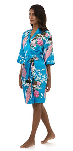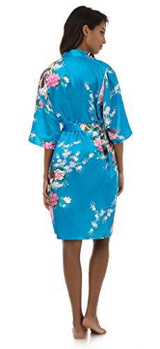 Dingwangyang Women's Peacock Print Half Sleeve Silk Kimono Bridesmaid Robe Nightgown(Turquoise,M)