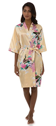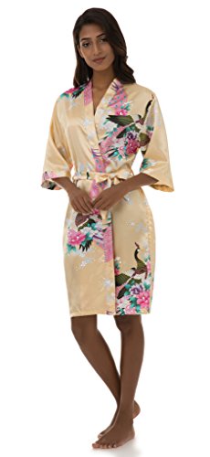 Dingwangyang Women's Peacock Print Half Sleeve Silk Kimono Bridesmaid Robe Nightgown(Gold,S)