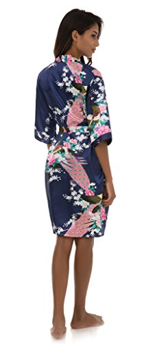 Dingwangyang Women's Peacock Print Half Sleeve Silk Kimono Bridesmaid Robe Nightgown(Navy,S)