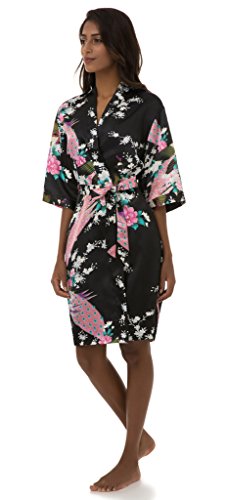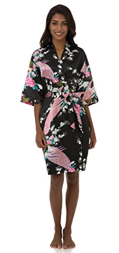 Dingwangyang Women's Peacock Print Half Sleeve Silk Kimono Bridesmaid Robe Nightgown(black,M)