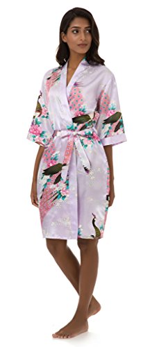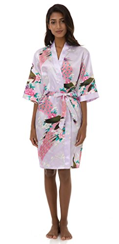 Dingwangyang Women's Peacock Print Half Sleeve Silk Kimono Bridesmaid Robe Nightgown(Light Purple,M)