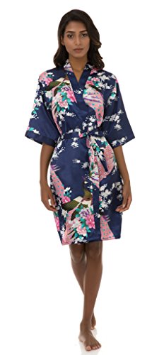 Dingwangyang Women's Peacock Print Half Sleeve Silk Kimono Bridesmaid Robe Nightgown(Navy,M)
