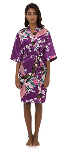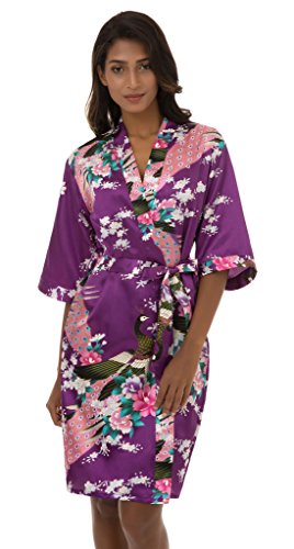 Dingwangyang Women's Peacock Print Half Sleeve Silk Kimono Bridesmaid Robe Nightgown(Purple,S)