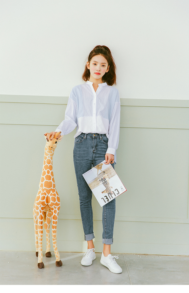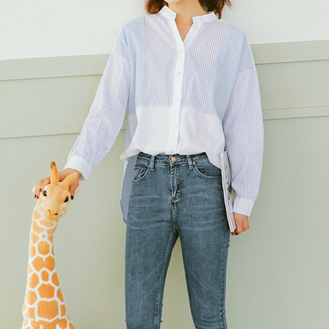 程よくゆったりとしたデザインなので体型カバーもでき、細身ストライプでトレンドライクな印象に仕上がります。