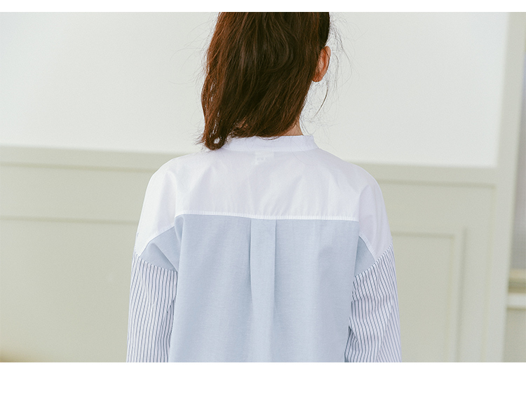 パッチワークのような生地の組み合わせがおしゃれで、春らしく爽やかな雰囲気の長袖ブラウスです。