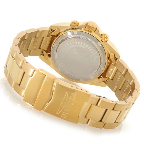 The men's Speedway collection by Invicta is stylish and versatile. Its comfortable bracelet, luxurious 18K gold plating, striking gold-tone dial, spectacular 200M water resistance capability and precise chronograph complication with units per hour addition makes this piece a must-have for any man's collection. Complete yours today.