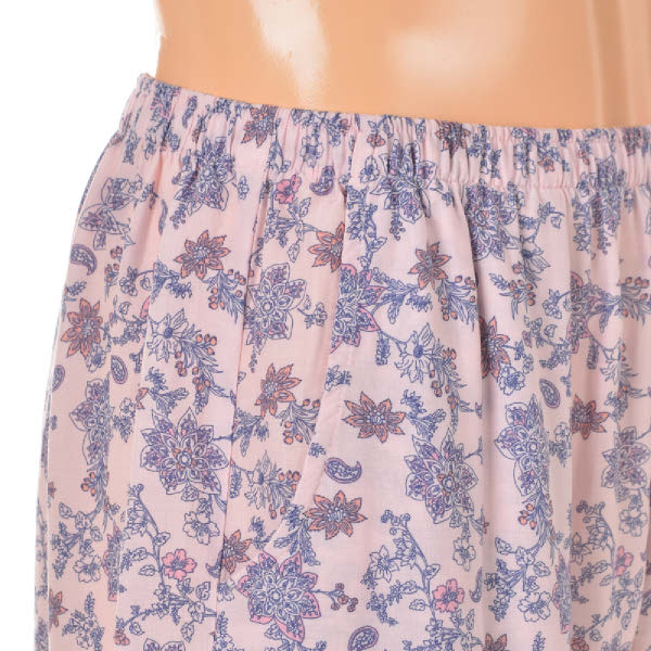 터치감이 좋고 시원한 촉감의 레이온 소재에피치 핑크 컬러 페이즐리 패턴으로여성스러운 홈웨어 상,하의 세트입니다보더로 목 'V'와 소매, 바지 밑단에 포인트를 준 디자인으로레이온 소재로 추동 초반까지 입을수있는 제품입니다.가벼운 소재로 여름철 시원하게 착용 가능하고,연령대 구분없이 감각적인 실내복을 찾는 분들에게 추천드리는 제품입니다.