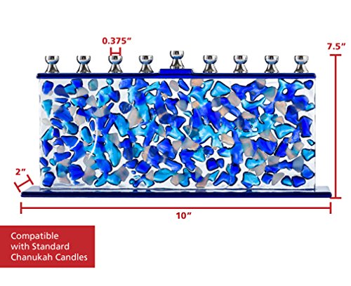 - HANDCRAFTED GLASS CONFETTI: With silver-toned candle holders standing atop a wall of aqua, white & cerulean blue pebbles, this candle menora is a work of art reminiscent of sea waves.