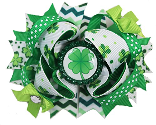 4.5 x 3 inch high quality stacked boutique St. Patrick’s Day hair bow made with several layers of grosgrain ribbon, complete with darling accent piece. Ends are heat sealed to prevent fraying.