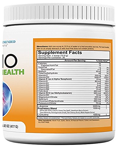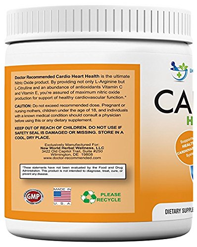 Studio : Norax Supplements Publisher : Norax Supplements Binding : Health and Beauty Product Description Doctor Recommended Cardio Heart Health is a dynamic composition of vitamins, minerals, and the well-studied L-Arginine. Each ingredient was chosen for its ability to contribute to your body's ability to produce Nitric Oxide, an important process for maintaining a healthy cardiovascular system. We've also included Antioxidants Vitamin C and E to help reduce the unwanted effects of oxidative stress on the cardiovascular system and help you feel your best. At Doctor Recommended, we value our customers and want the best for them! That's why we go through the process of making sure all of our dietary supplements and nutrition products meet strict GMP standards. We never use any GMOs (Genetically Modified Organisms), and all of our products are made in an FDA registered Facility. 0