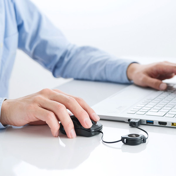 ●超小型で場所をとらず、持ち運びに最適な、ブルーLEDセンサー搭載のケーブル巻取りマウス