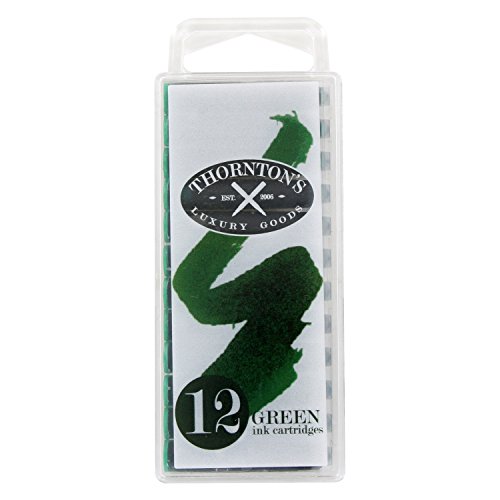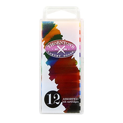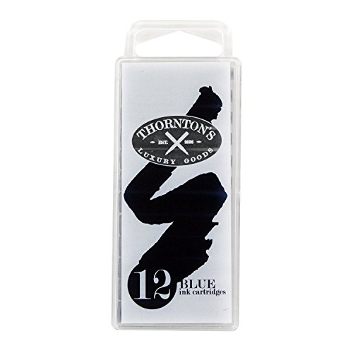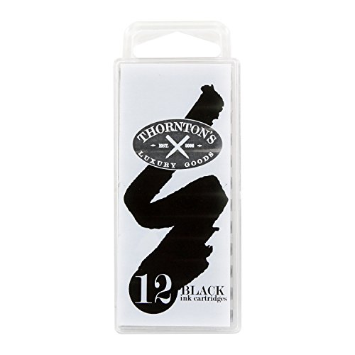 -. Binding : Office Product -. Brand : Thornton's Luxury Goods -. Feature : Thornton's ink cartridges have a neutral PH, excellent coverage, smooth flow. / The standard cartridges fit almost every cartridge/converter fountain pen on the market. / The 12-pack features a plastic reclosable case that will help preserve the life of the unused cartridges. / Each ink cartridge is 38.46mm long and 7.06mm in width. -. Label : Thornton's Luxury Goods -. Manufacturer : Thornton's Luxury Goods -. ProductGroup : Office Product -. ProductTypeName : WRITING_INSTRUMENT -. Publisher : Thornton's Luxury Goods -. Studio : Thornton's Luxury Goods -. Title : Thornton's Short Standard International Fountain Pen Ink Cartridges, Pack of 12
