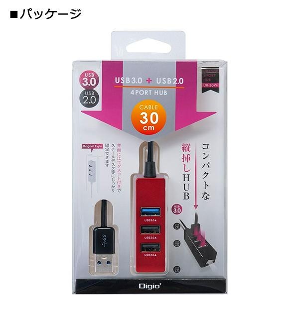 コンパクトな縦挿し4ポートハブです。底面マグネット付きでスチールデスク等に固定できます。4ポートのうち1ポートが「USB3.0」、3ポートが「USB2.0」対応となっています。 |