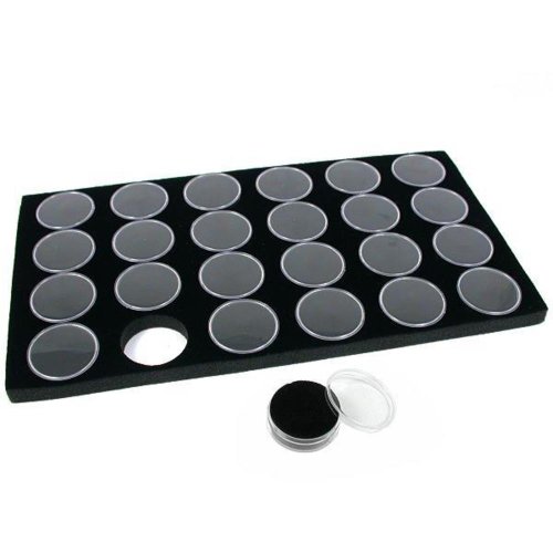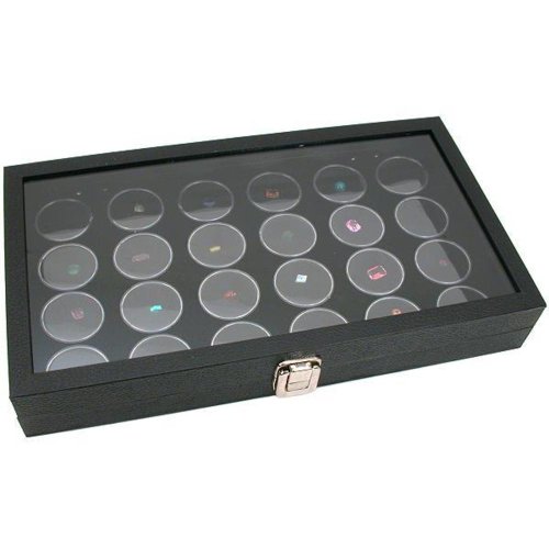 -. Binding : Kitchen -. Brand : FindingKing -. Color : Black -. Department : Womens -. Feature : This is a new glass top black display case / The glass top allows you to display your contents while keeping them dust free and secure / The latch on the lid helps keep you from losing any items / It measures approximately 14 3/4" x 8 1/4" x 2 1/8" (37.4 cm x 20.9 cm x 53 mm) / This is a new gem jar tray insert that contains 24 removable clear plastic round jars -. Model : KIT-10270 -. MPN : 65620966 -. PackageQuantity : 1 -. PartNumber : 65620966 -. ProductGroup : Jewelry -. ProductTypeName : FINEOTHER -. Title : Glass Top Jewelry Display Case Box Black 24 Gem Jars