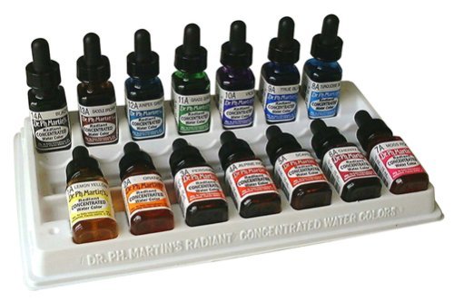 Dr. Ph. Martin's radiant concentrated water color is produced in an extremely concentrated form to achieve the greatest possible brilliance. Each liquid color comes in an iconic 0.5 oz (15 ml) glass bottle package with its own eyedropper. Dr. Ph. Martin's colors are primarily formulated for use in graphic arts work on paper surfaces intended for reproduction (e.g. cartooning, illustration, and other graphic arts), and are especially popular for airbrushing. Like all aniline dye base colors, they are fugitive when exposed to direct sunlight over time. For lightfast, archival watercolor use Dr. Ph. Martin's Hydrus fine art watercolor. Each set includes 14 different colors with a custom palette. 56 colors are available. Set A colors: 1A lemon yellow, 2A orange, 3A persimmon, 4A alpine rose, 5A scarlet, 6A cherry red, 7A moss rose, 8A turquoise blue, 9A true blue, 10A violet, 11A grass green, 12A juniper green, 13A saddle brown, 14A black.Feature