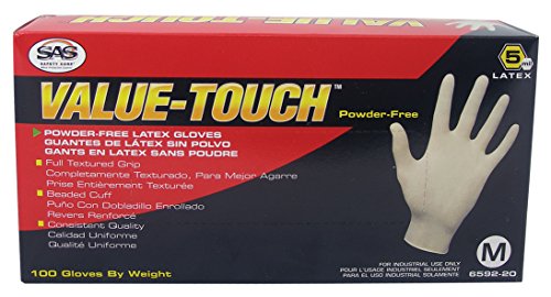 SAS Safety 6593-20 Value-Touch Powder Free Disposable Latex 5 Mil Gloves, Large, 100 Gloves by Weight