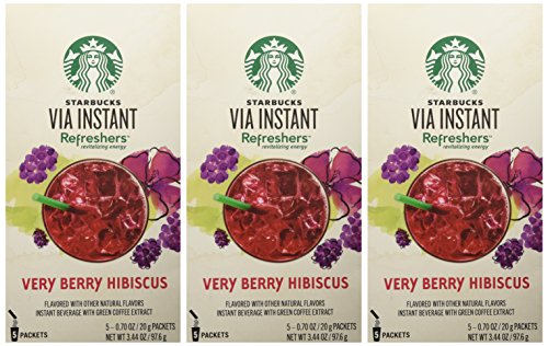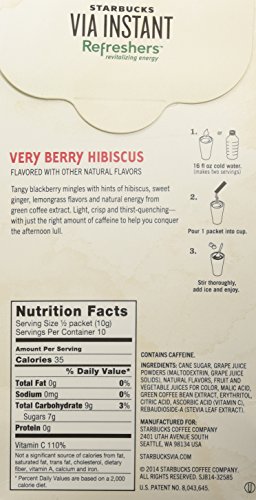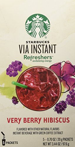 Re-energize with a thirst quenching combination of tangy blackberry and hints of hibiscus. Shaken with whole blackberries and a boost of natural energy from Green Coffee Extract, our handcrafted Very Berry Hibiscus Starbucks RefreshersTM beverage is a low-calorie afternoon recharge that tastes nothing like coffee.Feature
