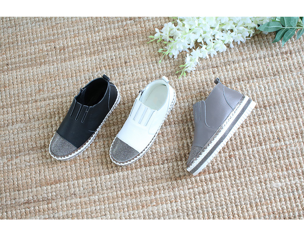 PR-3700. 아로마[MD COMMENT]유니크하면서도 캐주얼한 디자인으로 매력적인 슬립온입니다.부드러운 리얼소가죽 소재로 제작되어고급스러운 무드가 물씬 풍기는 요 아이템은블링블링 큐빅스타일로 트렌디한 슈즈랍니다!발전체를 감싸주는 디자인이라편안한 착화감으로 매일매일 신고싶어질거라 생각해요~!어느 스타일에나 물론 베이직한 룩에도포인트슈즈로 스타일링하기 좋은 슬립온으로 추천드려요! :)
