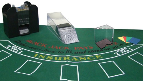 Studio : TMG Publisher : TMG Binding : Misc. Product Description This all-in-one blackjack combination pack provides you with everything you need to host your own blackjack party! This pack includes a blackjack felt, 6 decks of playing cards(brand of cards subject to change), a 6 deck blackjack shoe, a 6 deck discard tray, 4 cut cards, 100 chips and a 6 deck shuffler. This new portable felt has a layout for the popular casino game, Blackjack. Blackjack is a game played in Casinos around the world. Now bring the excitement of casino gaming to your home. The Layout is 36" by 72" and can be easily used on a home table for parties. The layout travels well and is water resistant. Great for a gift! This Casino Grade Black Jack Shoe is a must for any Black Jack player. This heavy duty acrylic Black Jack shoe is perfect for dealing Black Jack.The Wedge is heavy weighted to ensure the appropriate amount of pressure is placed on the cards to ensure they stay flush with the surface of the dealing slot. This shoe holds 6 decks easily. The cards slide out of the front dealing slot efficiently to ensure a professional like dealing experience. The Casino Grade Discard is also heavy Duty Acrylic. This Tray holds 6 decks easily. The cards are held in place by the 2 walls and stack until your dealing shoe is empty. This 6 Deck Automatic Card Shuffler is battery operated. It shuffles standard or bridge sized playing cards. This uses 4 "C" Sized batteries, not included. Over a $125 retail value! This is a great buy and you are getting great quality, brand new equipment. Great for home casino nights or parties! 0