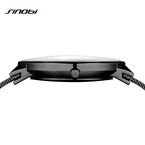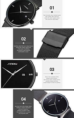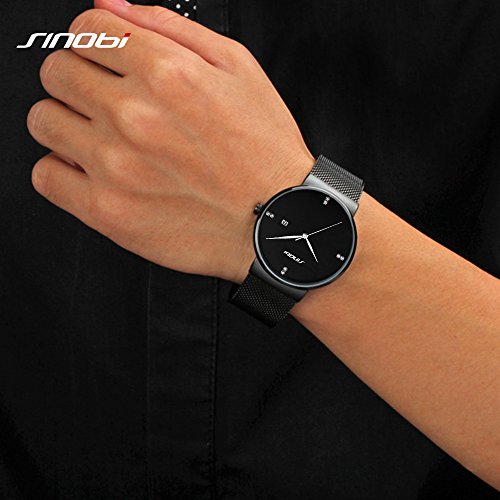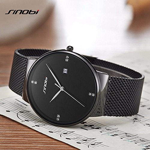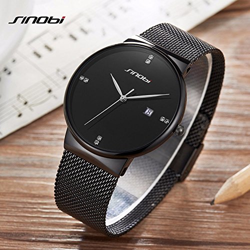 -. Feature : A. Minimalism Wristwatch Design: Classical simple black watch dial design, auto date window, ultra slim light case, comfortable and durable mesh watchband strap, silver fine hands pointers with artificial crystal diamond indexes, full of fashion casual free style. / B. Selected Watch Material: Selected smooth steel mesh watchband,black alloy mental case and stain steel case cover, Hardlex raised dial window, Japanese movement, hard paper gift box. More free style time and comfortable wearing experience. / C. Standard Men Women Wristwatch Size:Dial Diameter: 42mm, Case Thickness: 6.5 mm, Band Width: 20mm, Band Length: 23cm, Water Resistance Depth: 3Bar. Watch mesh bracelet could be adjusted for more cosy size, also watchband is replaceable. / D. Instruction For Use and Maintenance: Bubble and hard gift box and additional spongia package keep watch well in transition. Clear window and simple pins hand pointers make it easy to read. More straps like leather, mesh band are highly recommended. / E. What's Included:1* SINOBI Men watch, 1* gift box, 1* instruction book, 30 days free return, 30 days replacement, 365 days warranty period. Any question please feel free to contact seller service first.