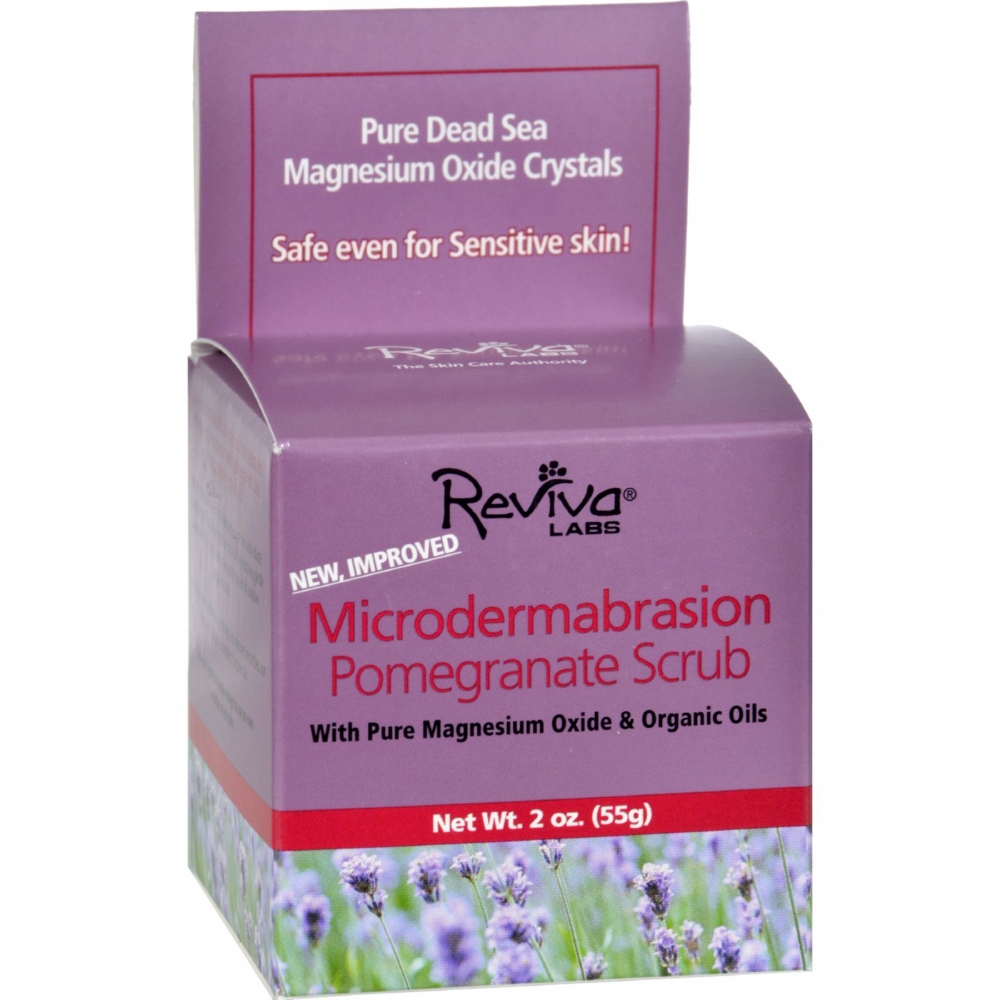 | Reviva Labs Microdermabrasion Pomegranate Scrub Description: With Pure Magnesium Oxide and Organic Oils Pure Dead Sea Magnesium Oxide Crystals Safe Even For Sensitive Skin! Now even sensitive skin can enjoy microdermabrasion! With pure mild magnesium oxide, pomegranate, and soothing, calming organic oils.